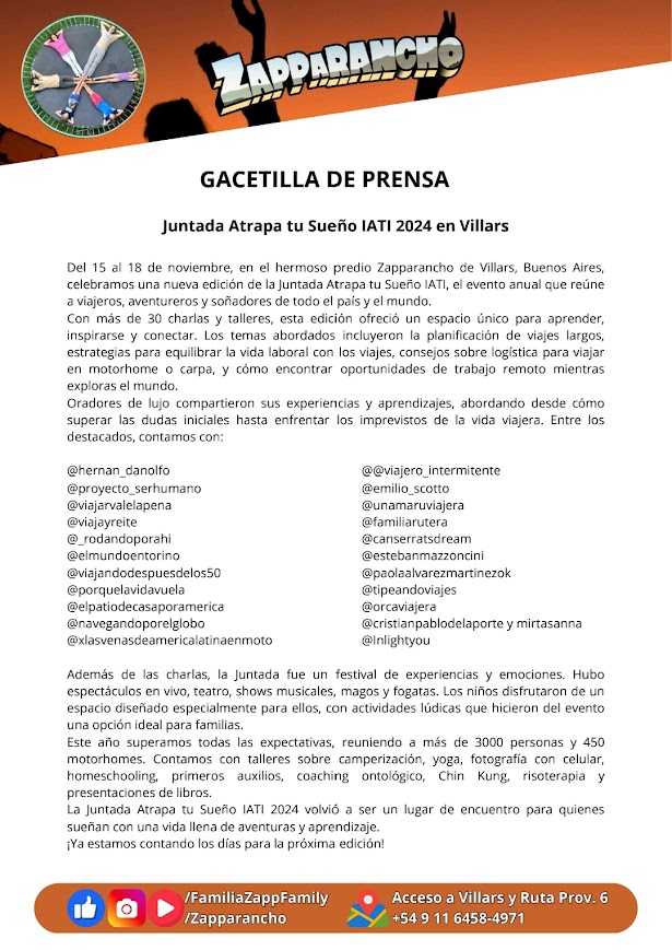 Somos la Familia Zapp, estuvimos 22 años viajando por el mundo y nos asentamos en Villars, Buenos Aires. Creamos el Zapparancho ¡un auténtico lugar de viajeros para viajeros! Todos son bienvenidos a conocer la magia de este lugar.
