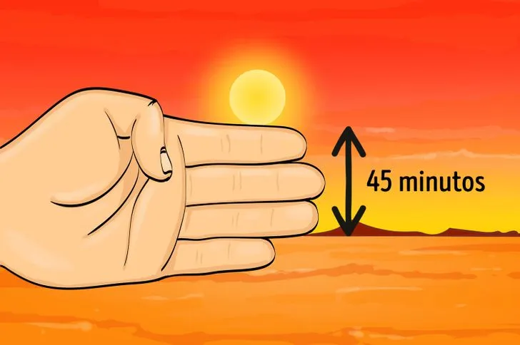 - Usa tus dedos: Coloca tus dedos en línea vertical, uno encima del otro. Cada dedo representa aproximadamente 15 minutos de tiempo antes de que el sol se ponga o se eleve, según su altura en el cielo.