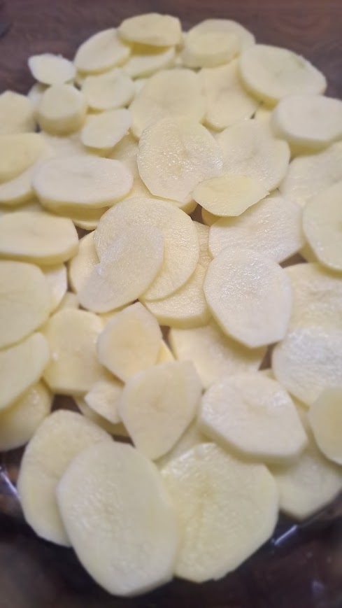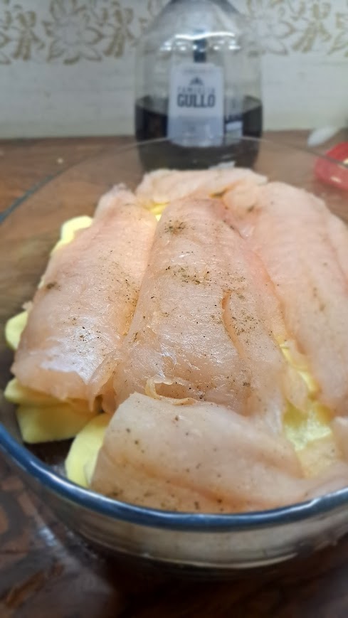 Condimentar a gusto con sal y pimienta los filetes de Lenguados, cortar las papás en rodajas finas.