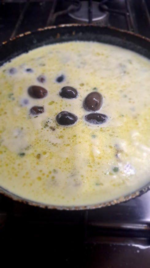 Poner los filetes arriba, luego, sofreír con aceite de oliva las cebollas de verdeo cortadas finas y el ajo picado y agregar la crema unos 5 minutos y las aceitunas
