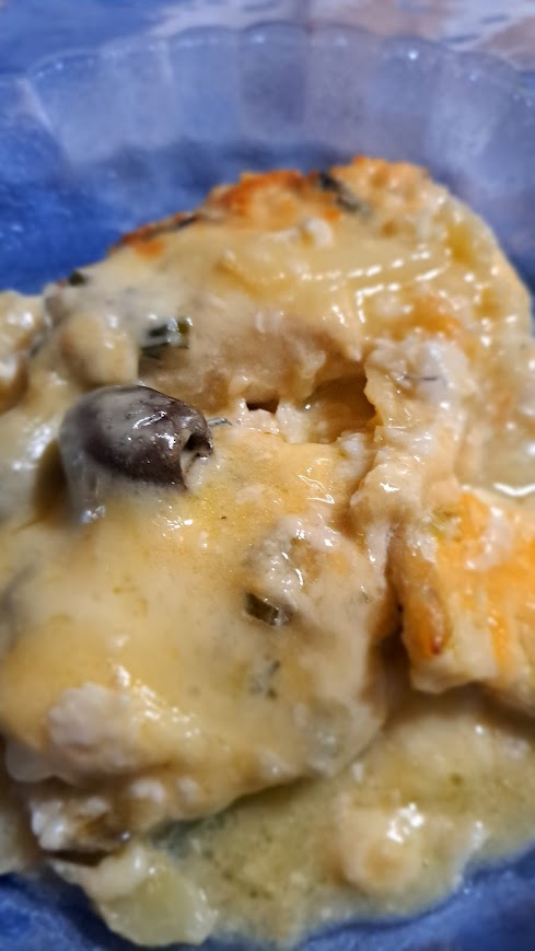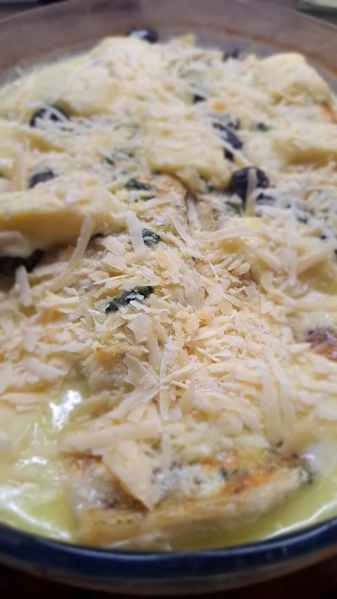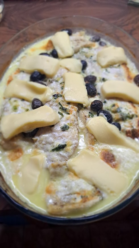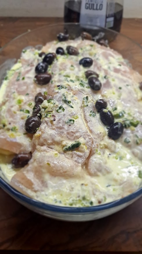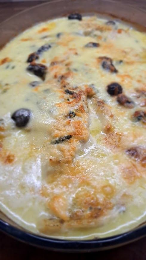 Ingredientes: 3 kilos de Lenguado fresco. 3 Plantas de cebolla de verdeo , aceite de oliva, 4 papas, aceitunas negras, Queso Parmesano 300 gramos y mozzarella 600 gramos. Un pote de 500 gramos de crema de leche ,sal y pimienta a gusto. Y 3 dientes de ajos