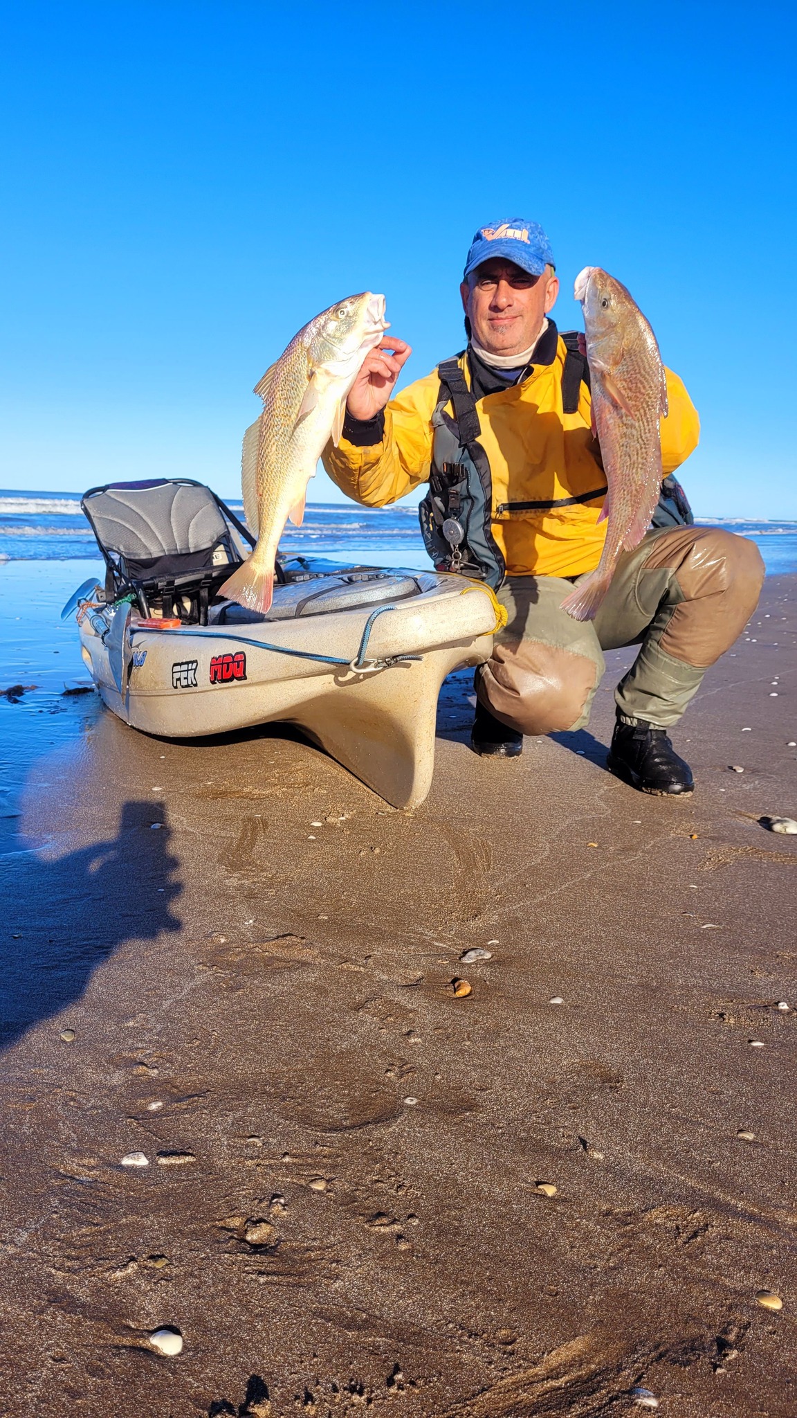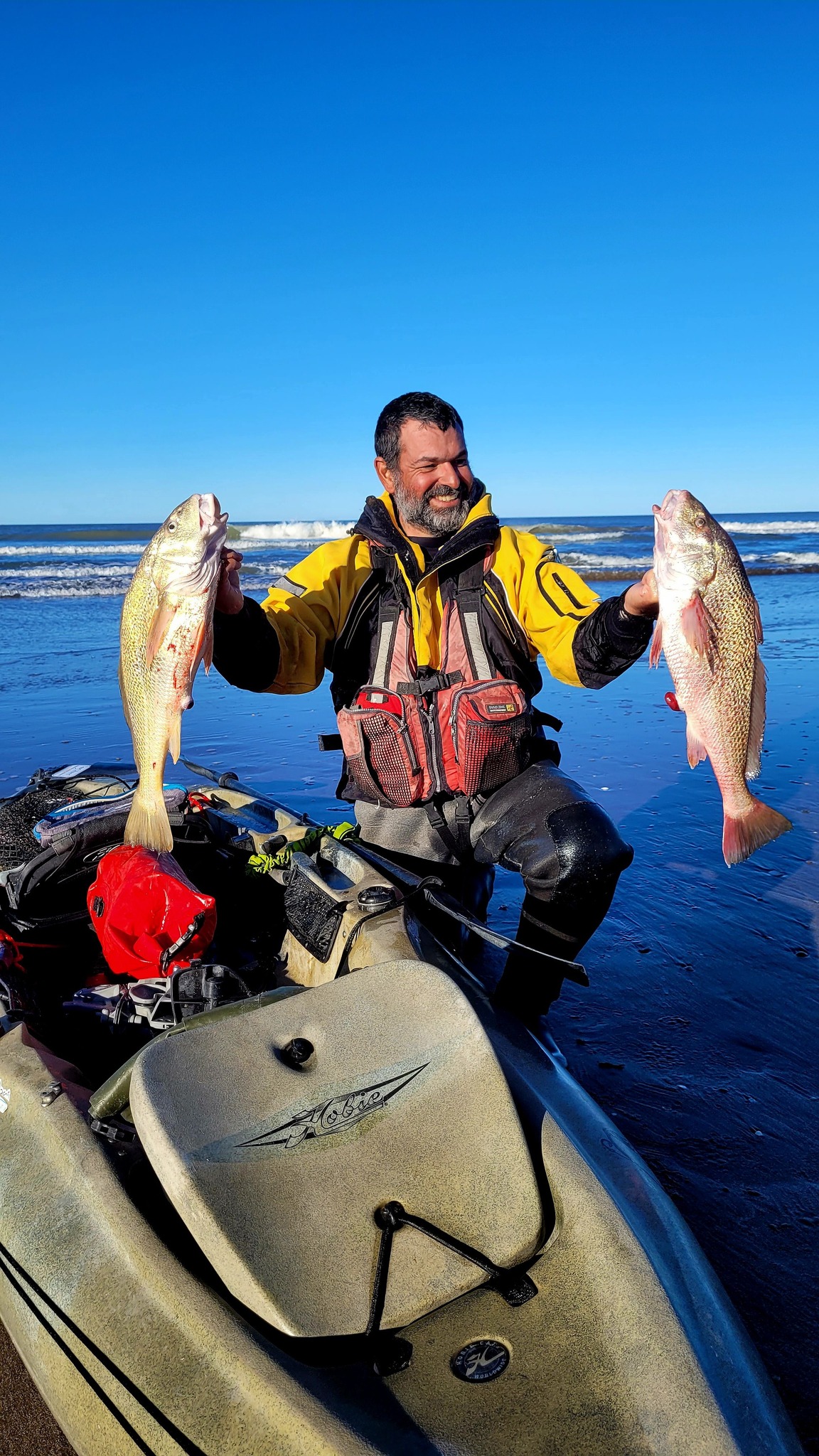 Viajamos toda la noche para llegar al amanecer al faro de Punta Médanos y aprovechar al máximo una jornada de pesca en el mar. Como no teníamos carnada preparada, improvisamos: Emilio compró colas de langostino y yo llevé algunos peces de río, entre ellos sábalo y pejerrey. Él pescó en su Navío Escualo, yo en mi Hobie Outback, y juntos hicimos una jornada súper entretenida desde el kayak. Corvinas, rayas, pescadillas, congrios, melgacho y gatuzos dijeron presente en una de esas salidas que valen cada minuto de esfuerzo. ¡Gracias por acompañarnos en otra aventura!