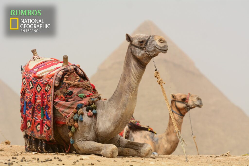 El lente largo, el foco sobre los animales, las formas inequívocas de las pirámides de Keops y Micerinos en el fondo.