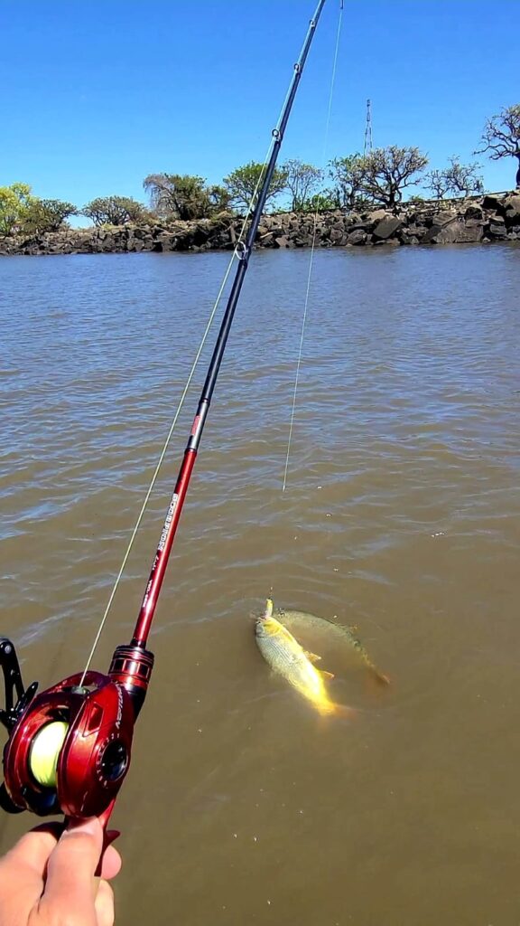 De repente, una explosión. El agua se rompió con furia y la caña se arqueó como si quisiera tocar el cielo. El dorado había mordido, y no estaba dispuesto a rendirse. Saltó, giró, tironeó con una fuerza que parecía imposible. Rodrigo lo sostuvo con firmeza, sintiendo en sus brazos la danza salvaje de un pez que no se deja domesticar.